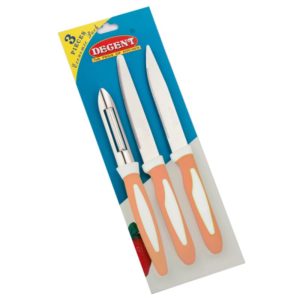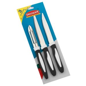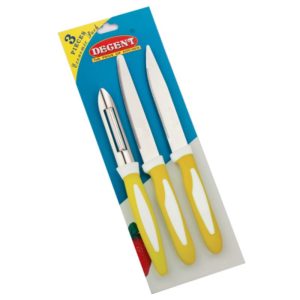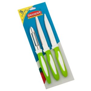 - The Economic Set. As the name says contain all the essential knife which are used on a daily basis i.e Vegetable knife, Laser Knife, Vegetable Peeler. It has Stainless steel blades and Polypropylene handles.
